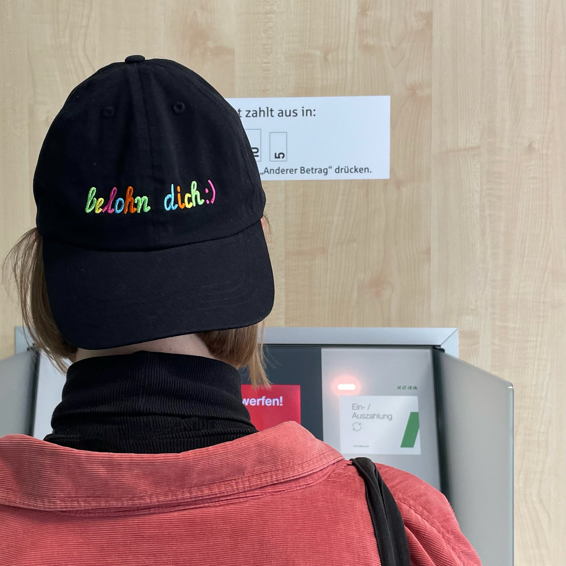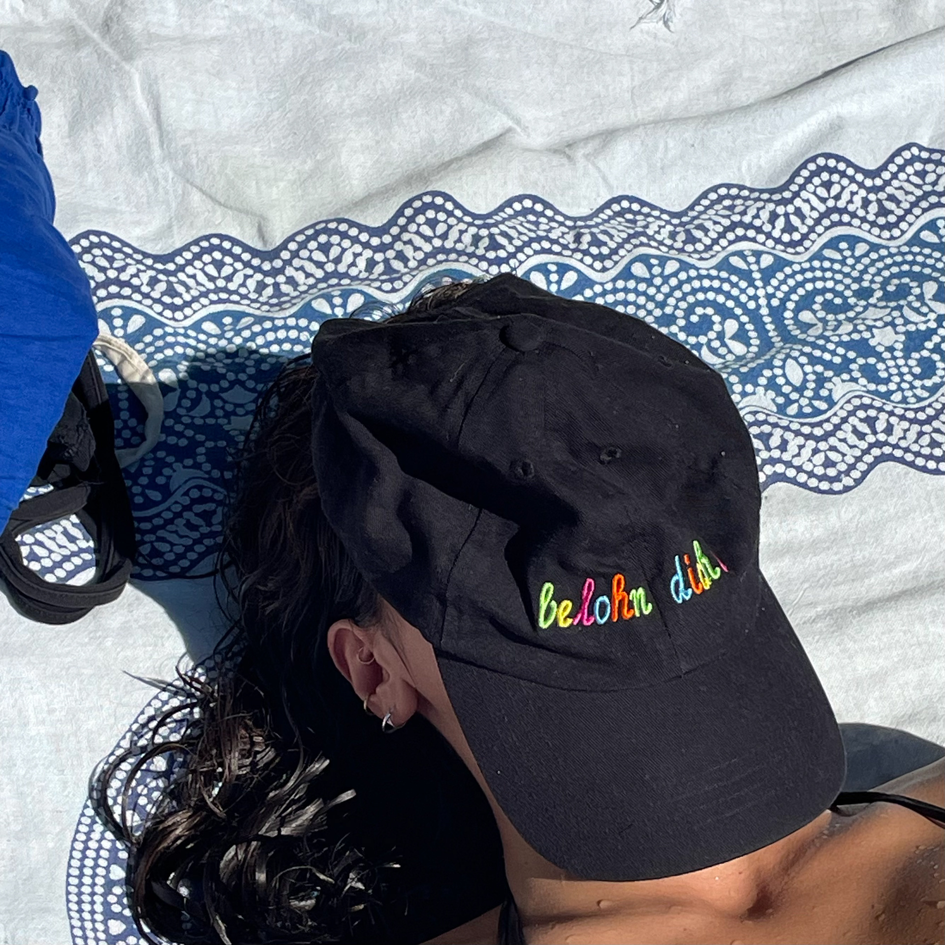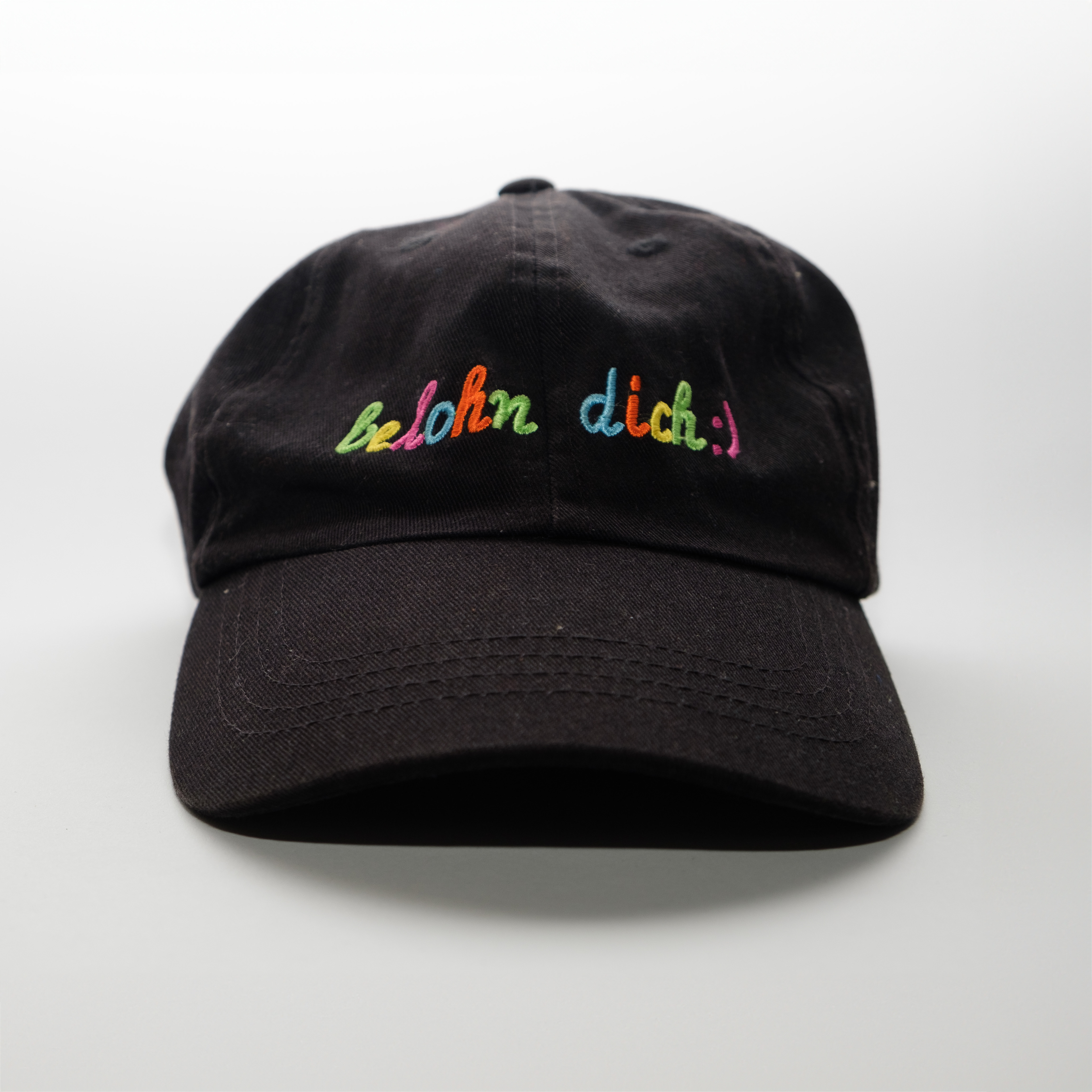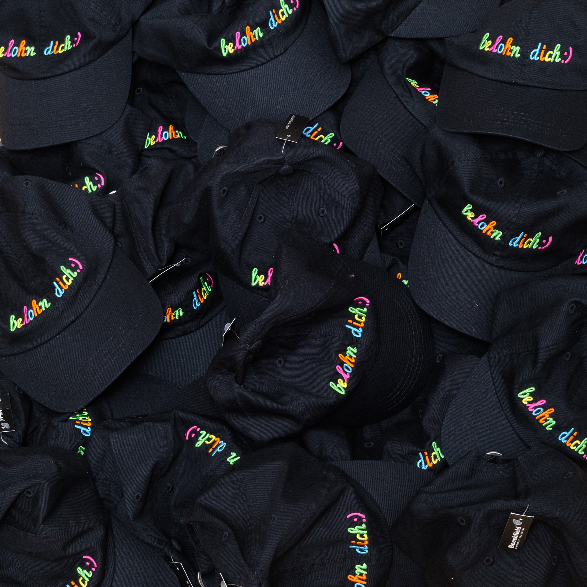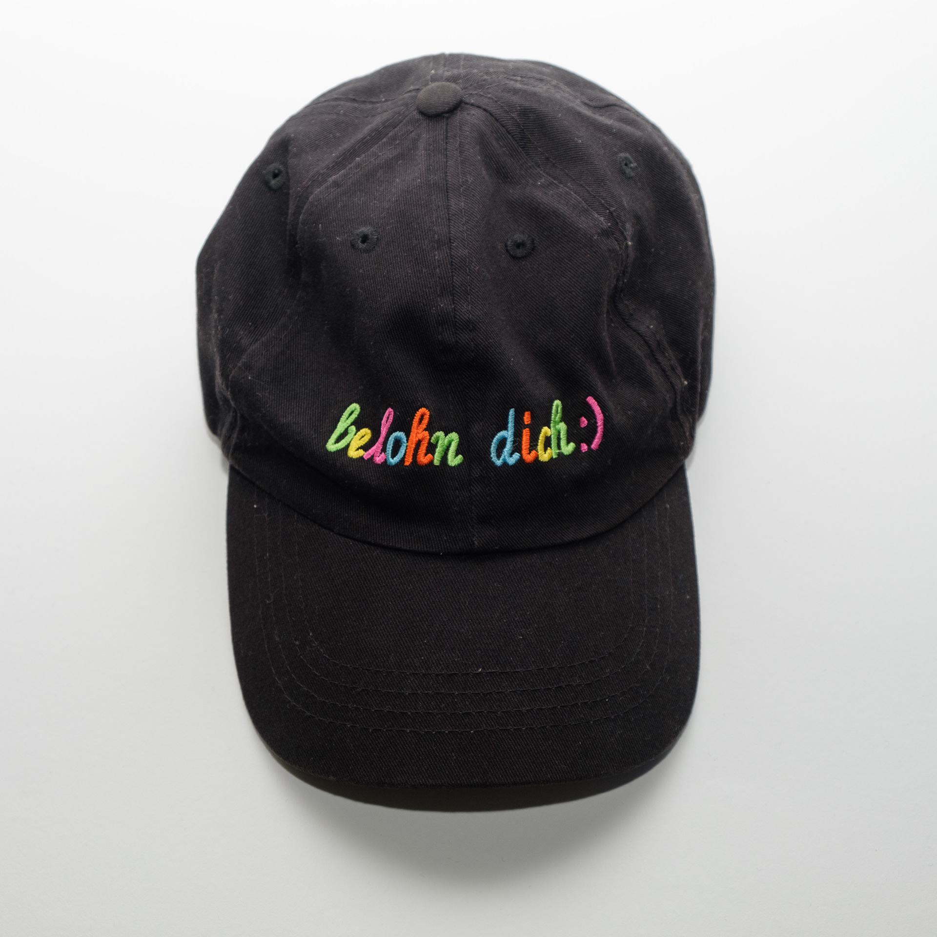 | »belohn dich« | Bunter Stick auf schwarzer Baumwollcap | Frankfurt, 2023 |
